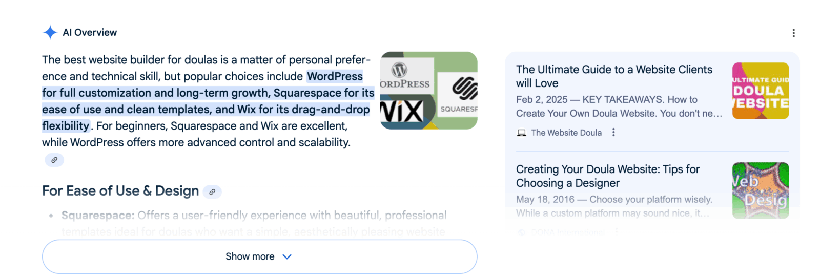 I recently noticed that I was NOT showing up in search results for the key question: What is the best website builder for doulas? Yikes! I quickly put together a new blog post called “The Ultimate Guide to Doula Websites” and optimized the heck out of it. It is PACKED with helpful information and links to additional resources.